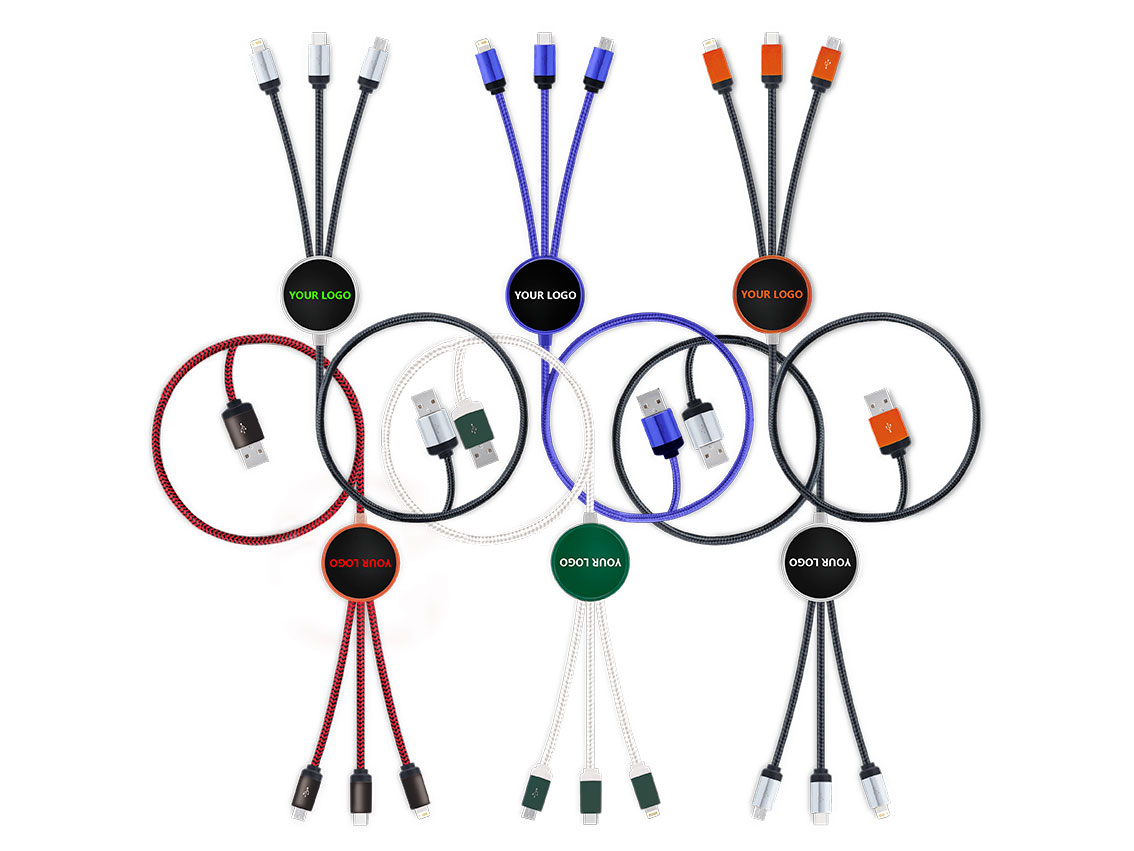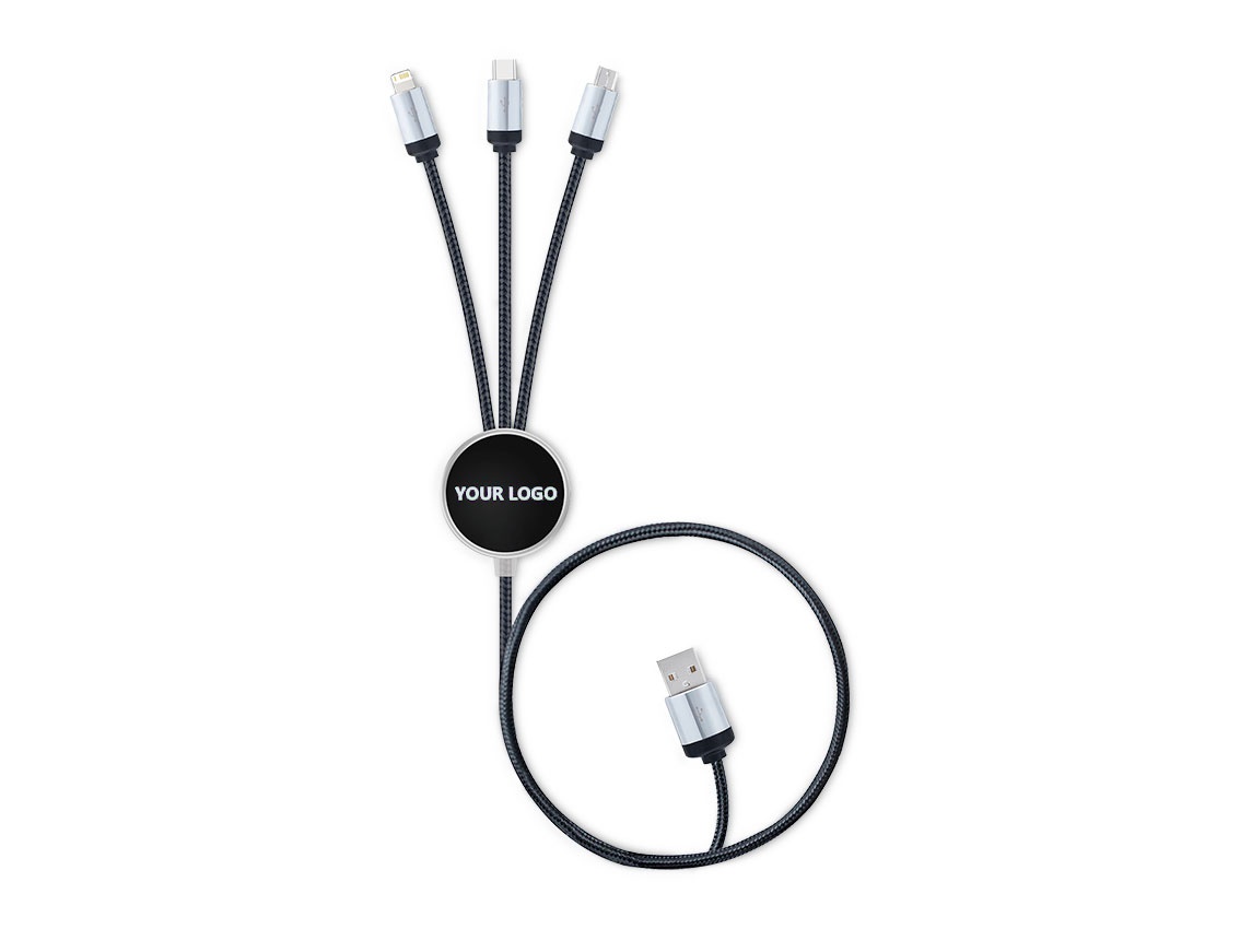 Universal charging cable with Micro USB, USB-C and Lightning connectors. Unique design with the possibility of backlit LED logo. The connector shells and the center frame can be selected in a glossy, matt or rubber version. The 120 cm cable has a nylon cover for more comfortable handling.