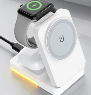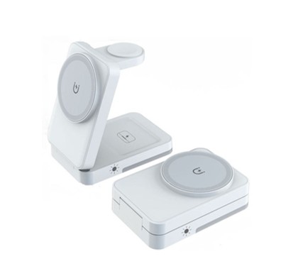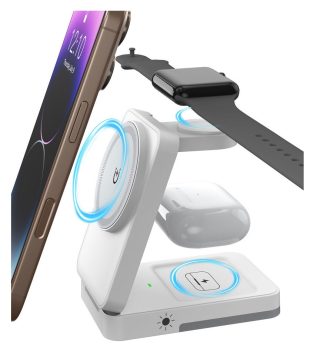 Magnetic wireless charger allows simultaneous charging of a mobile phone, smart watch and AirPods. Supports multiple power levels – up to 15 W for a mobile phone. ABS construction ensures strength and durability in everyday use. Compact dimensions are suitable for a desk or bedside table.