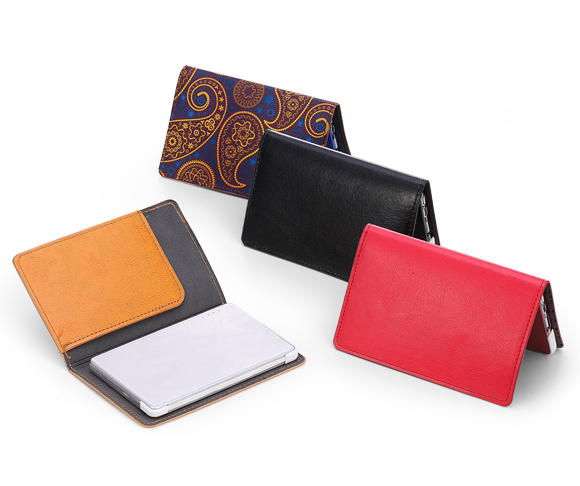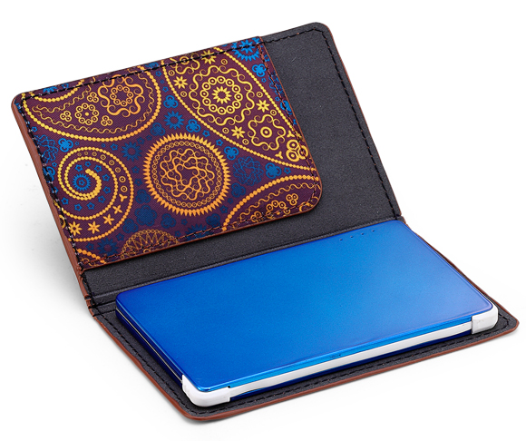 The power bank also features a leather case that can be used as a business card holder. The product is perfect for promotional prints.