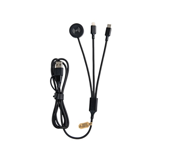 This multi-purpose cable in black features magnetic connectors and offers a combination of USB-C and USB-A outputs with the option of connecting to Lightning or a charging connector for iWatch. All in one – no need to carry multiple different cables. This makes it ideal for everyday use at home, in the office and on the go. The cable supports charging up to 10W (5V / 2A) for devices with USB-C and Lightning connectors and 5W (5V / 1A) for iWatch. Made from environmentally friendly RPET material, contributing to a more sustainable lifestyle.
