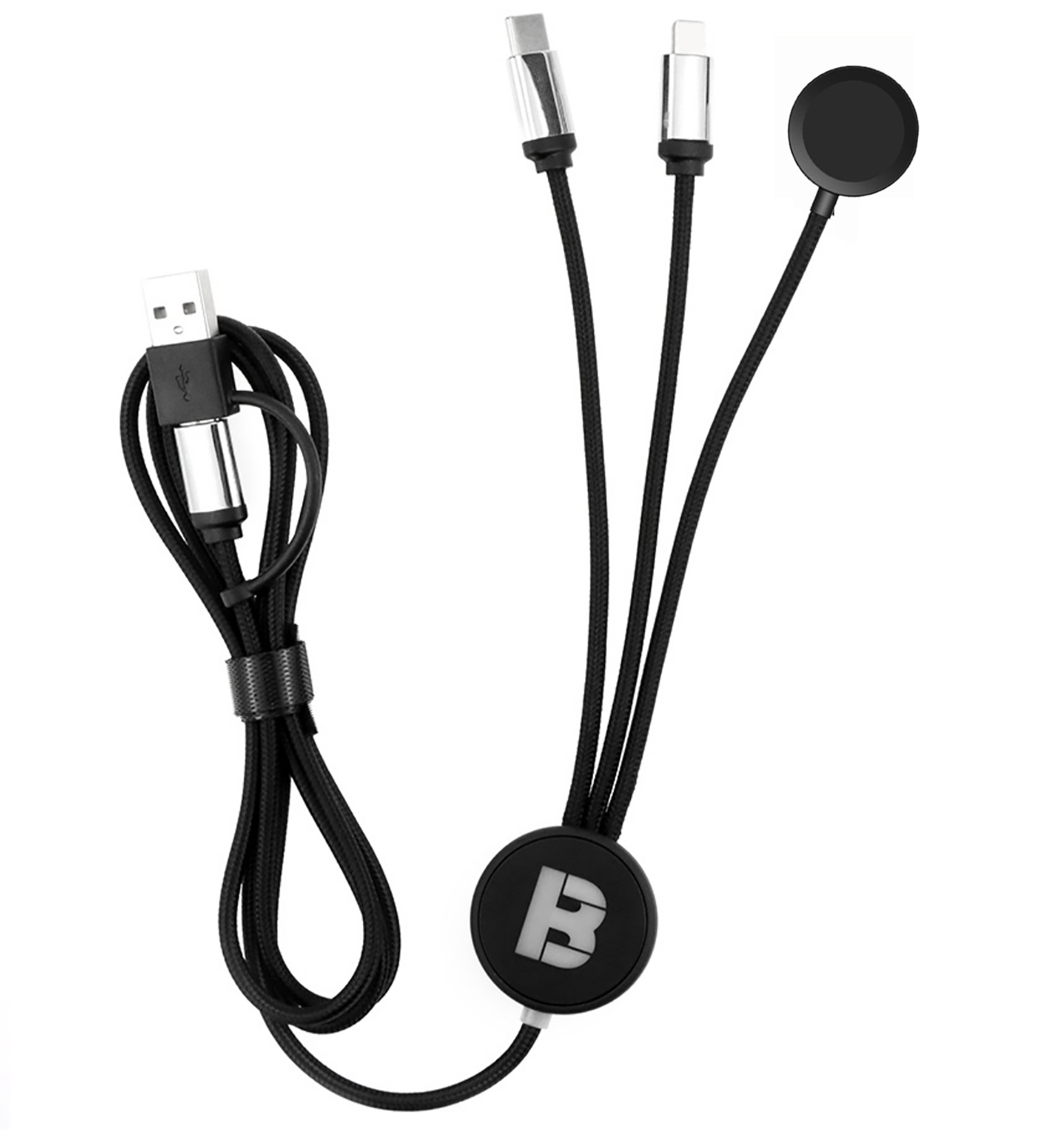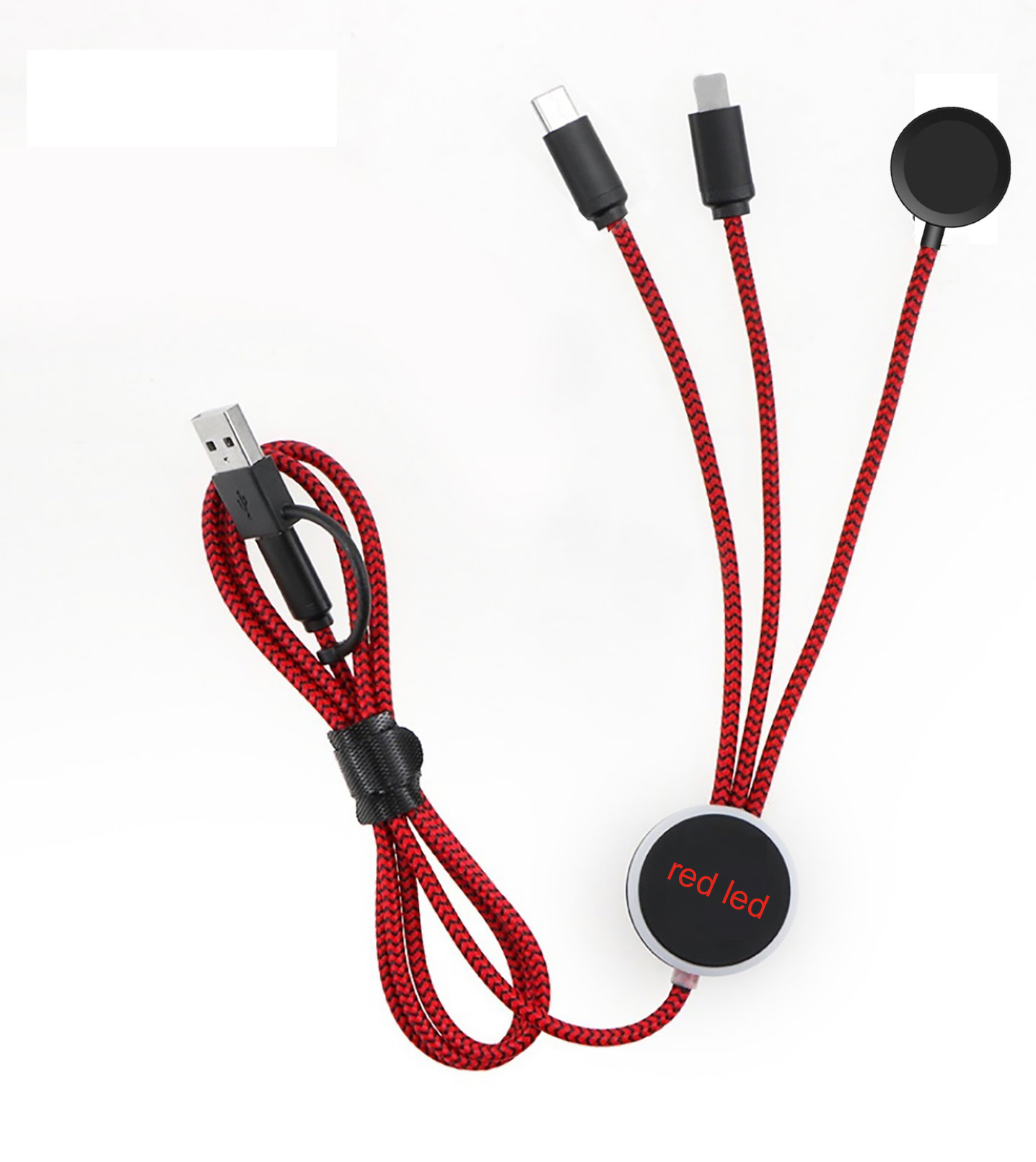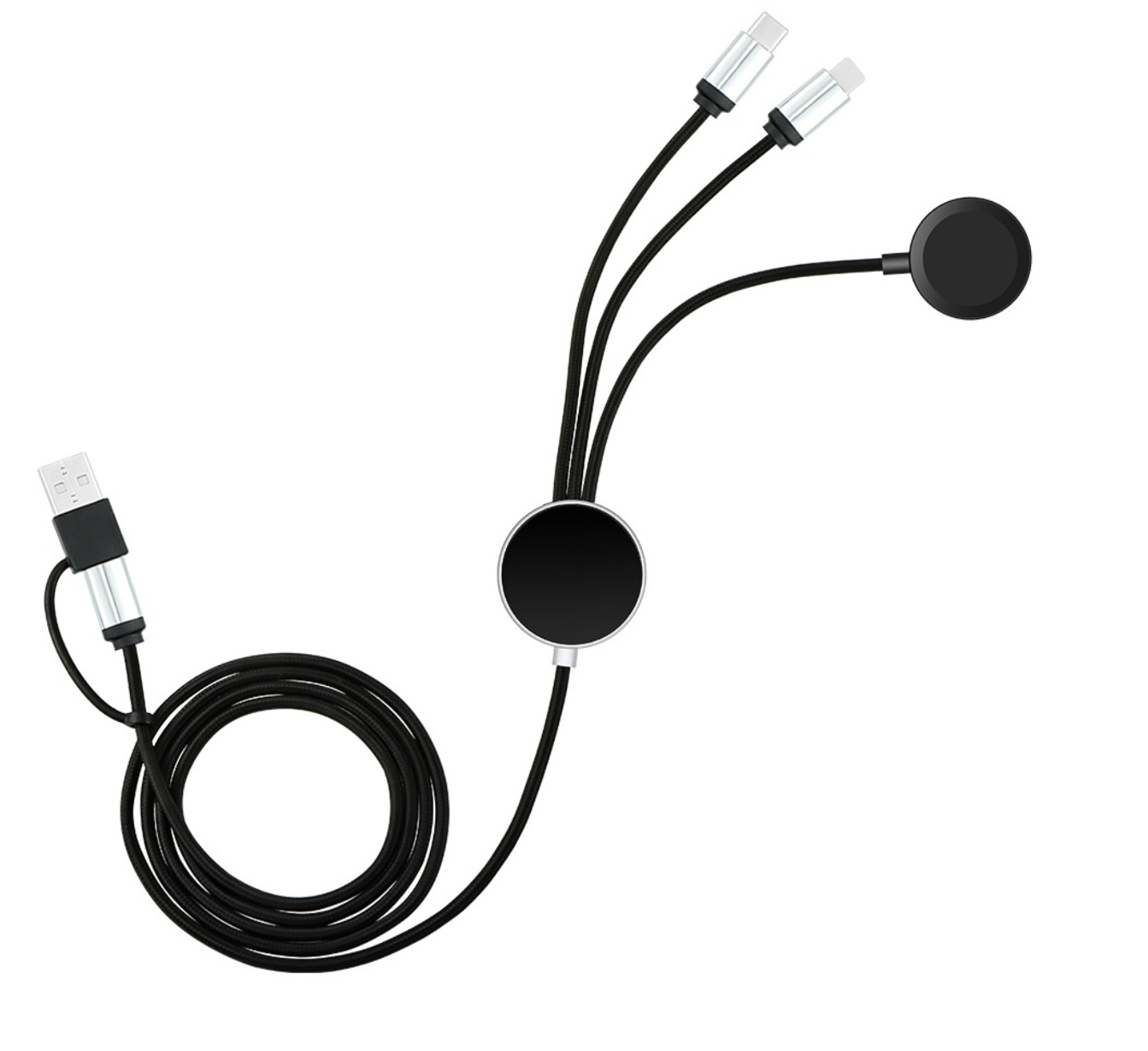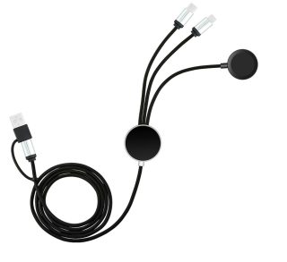 The universal charging cable is designed for simultaneous charging of mobile devices and smart watches. It is equipped with USB-A and USB-C inputs, which allow flexible connection to various power sources. The outputs include USB-C and Lightning connectors, supplemented by a magnetic wireless charger for smart watches Apple Watch and Samsung Watch. The maximum output power of the cable is 5 V / 2 A. The cable is 1.2 m long and is made of durable nylon braid for increased durability in everyday use. The connectors and the cable body are made of solid ABS material. The cable is available in black, blue and red. The integrated LED backlight is available in white, blue, red, green and orange.