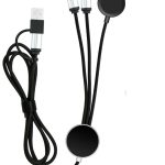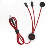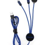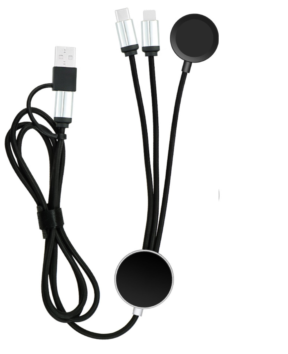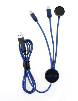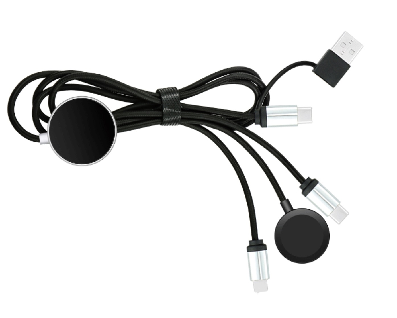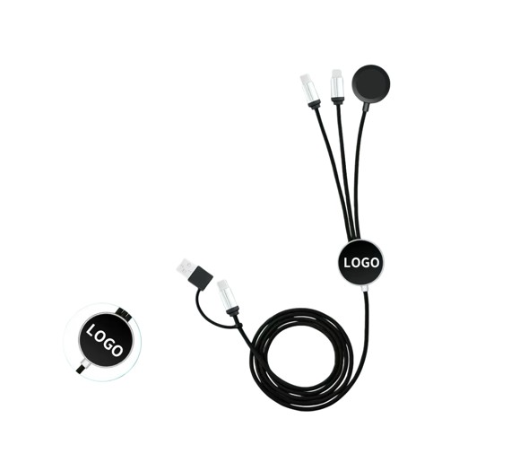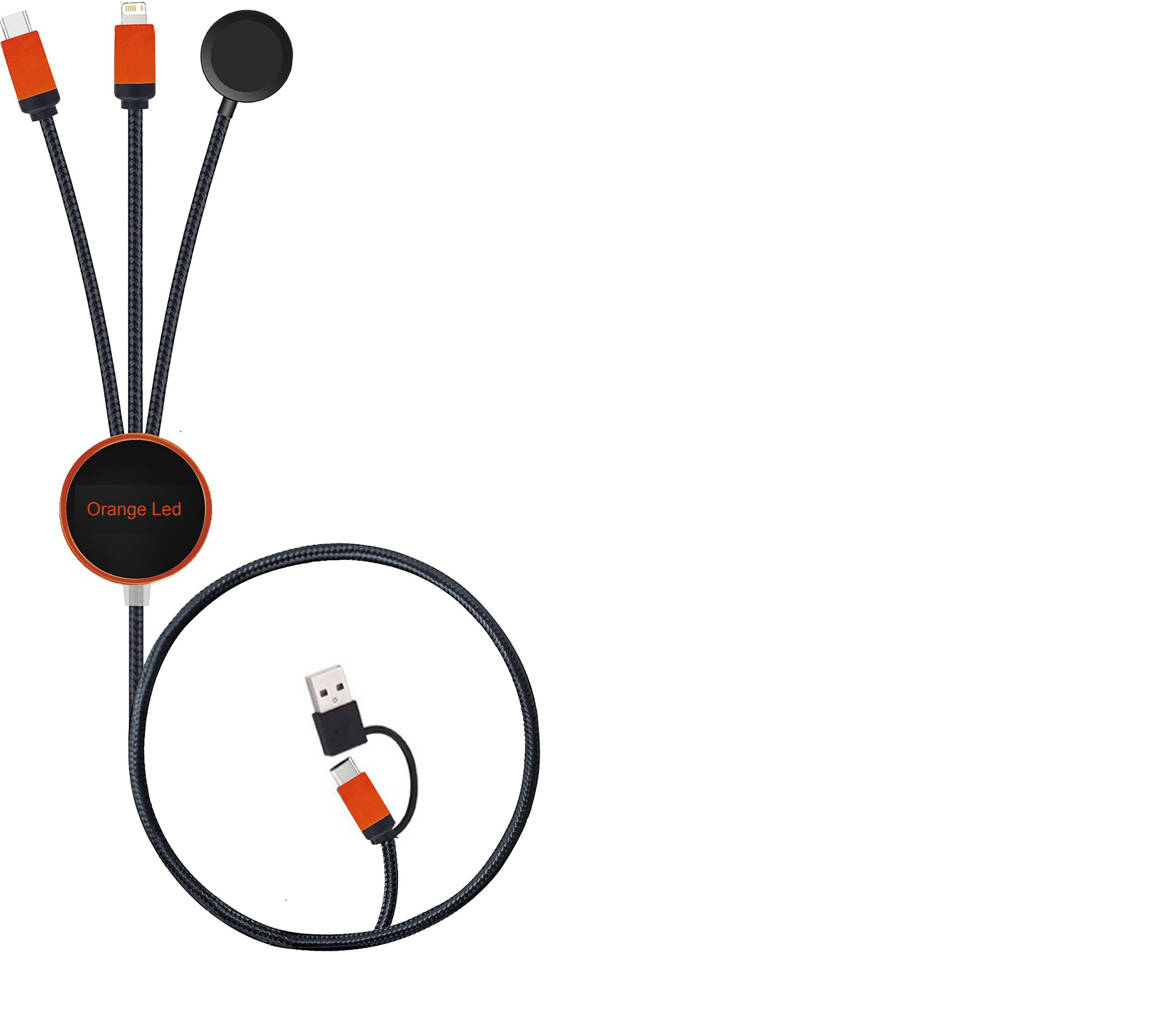 The universal charging cable is designed for simultaneous charging of mobile devices and smart watches. It is equipped with USB-A and USB-C inputs, which allow flexible connection to various power sources. The outputs include USB-C and Lightning connectors, supplemented by a magnetic wireless charger for smart watches Apple Watch and Samsung Watch. The maximum output power of the cable is 5 V / 2 A. The cable is 1.2 m long and is made of durable nylon braid for increased durability in everyday use. The connectors and the cable body are made of solid ABS material. The cable is available in black, blue and red. The integrated LED backlight is available in white, blue, red, green and orange.