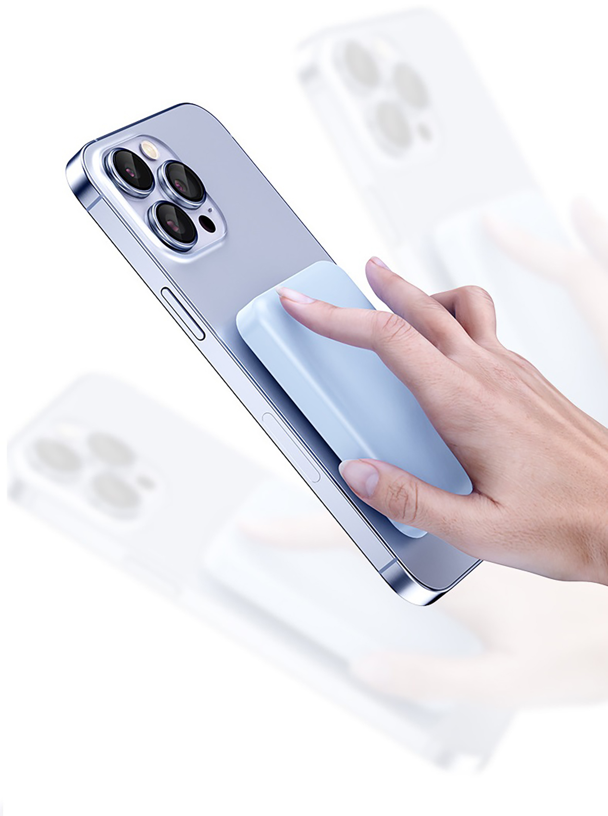 The magnetic powerbank 5000mAh allows for fast charging via USB-C and wireless charging up to 15W.